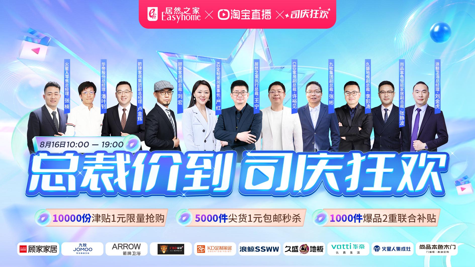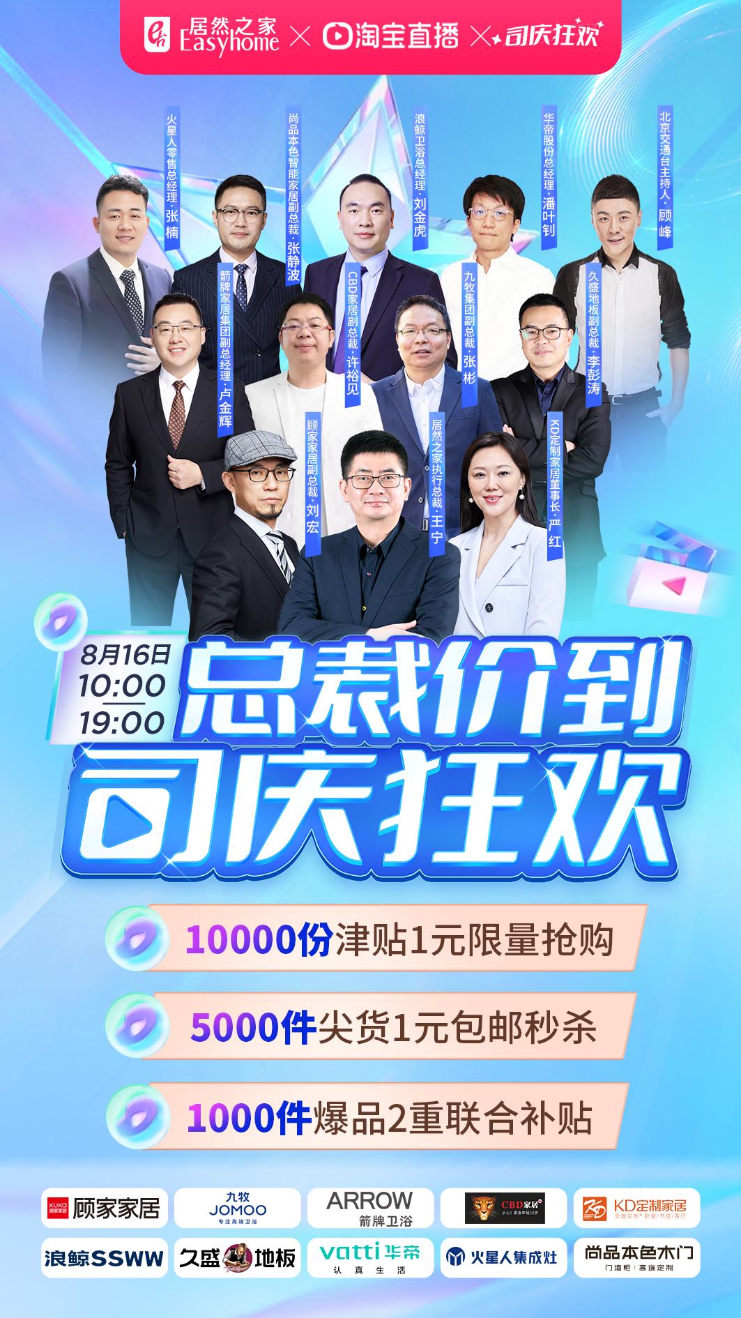 在8月16日,“总裁价到,司庆狂欢”的活动会场,居然之家集团执行总裁王宁携KD定制家居董事长严红、CBD家居副总裁许裕见、尚品本色智能家居副总裁张静波、九牧集团副总裁张彬、华帝股份总经理潘叶钊、箭牌家居集团副总经理卢金辉、久盛地板副总裁李彭涛、火星人零售总经理张楠、顾家家居副总裁刘宏、浪鲸卫浴总经理刘金虎,共同为粉丝送上5000件1元秒杀好礼,数十款品牌居然专属爆款产品,万份百倍升值礼包。大量重磅福利让消费者抢得开心,购得满足。同时,居然之家也结合洞窝,天猫同城站,小程序等渠道,为有家装需求的消费者提供24小时在线选购、以旧换新、到家维修、会员权益兑换、自营家装服务等多样化的大家居大消费服务。